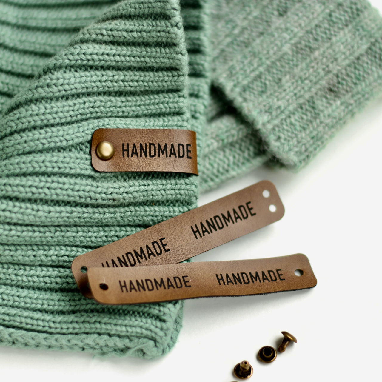 Add the perfect finishing touch to your creations with our "Handmade" Faux Leather Tags. These durable tags offer two options for easy attachment: snap rivets for a quick and secure fit, or a two-hole design for simple hand sewing. Ideal for giving your handmade items a professional, personalized touch, these tags add a charming detail to knitted items, crochet projects, accessories, and more.