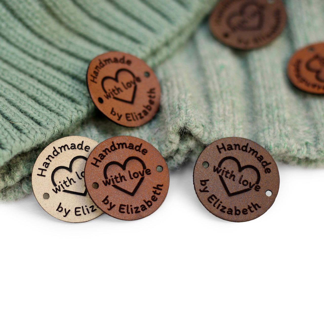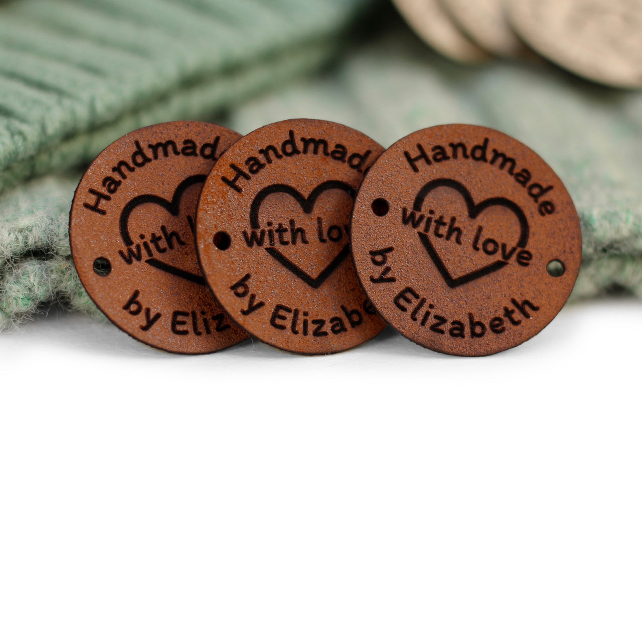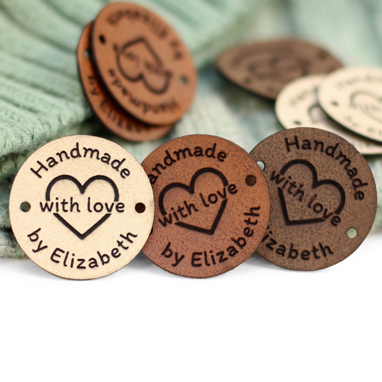 Your chosen quantity of Handmade with Love by [Your Name] faux leather tags in your selected colors.