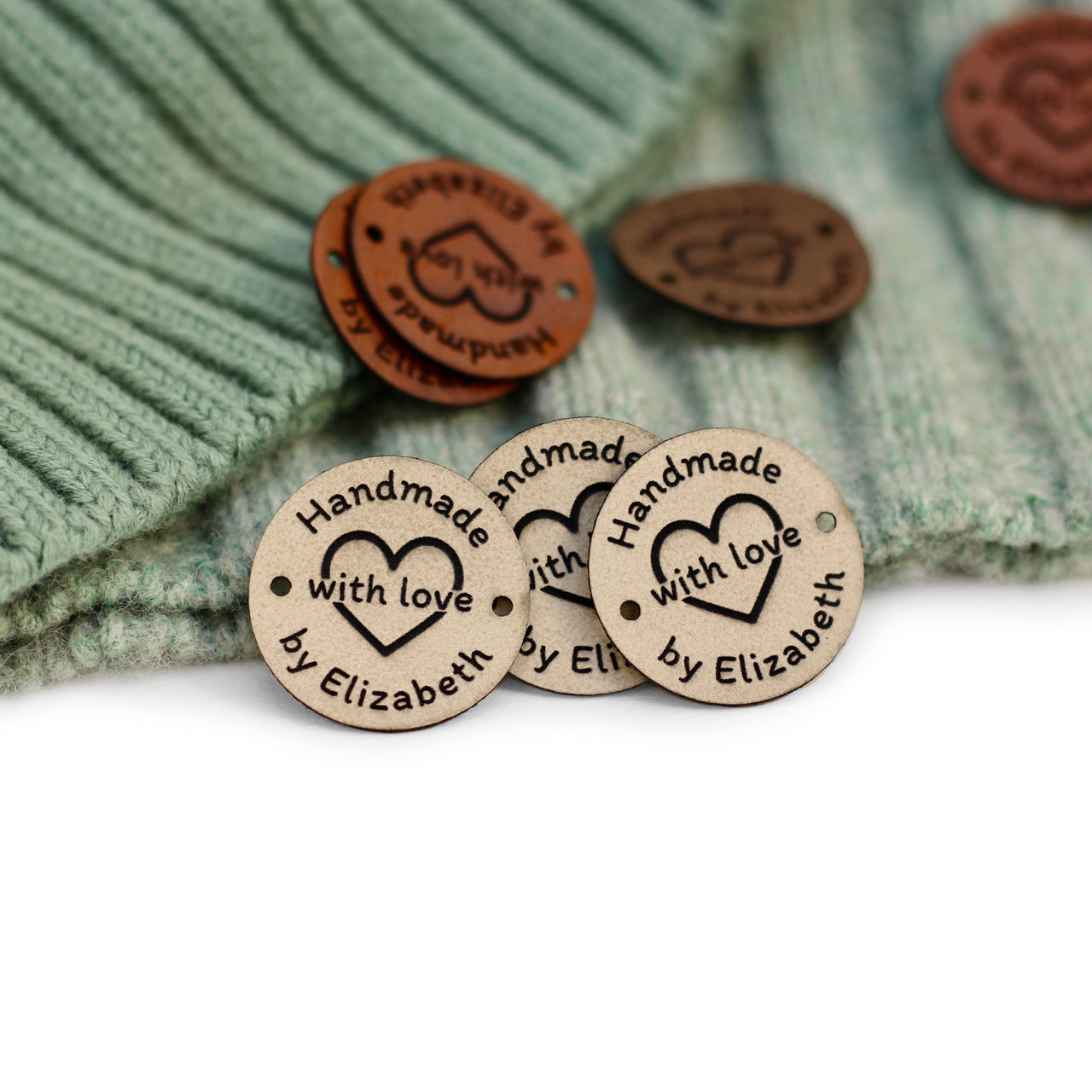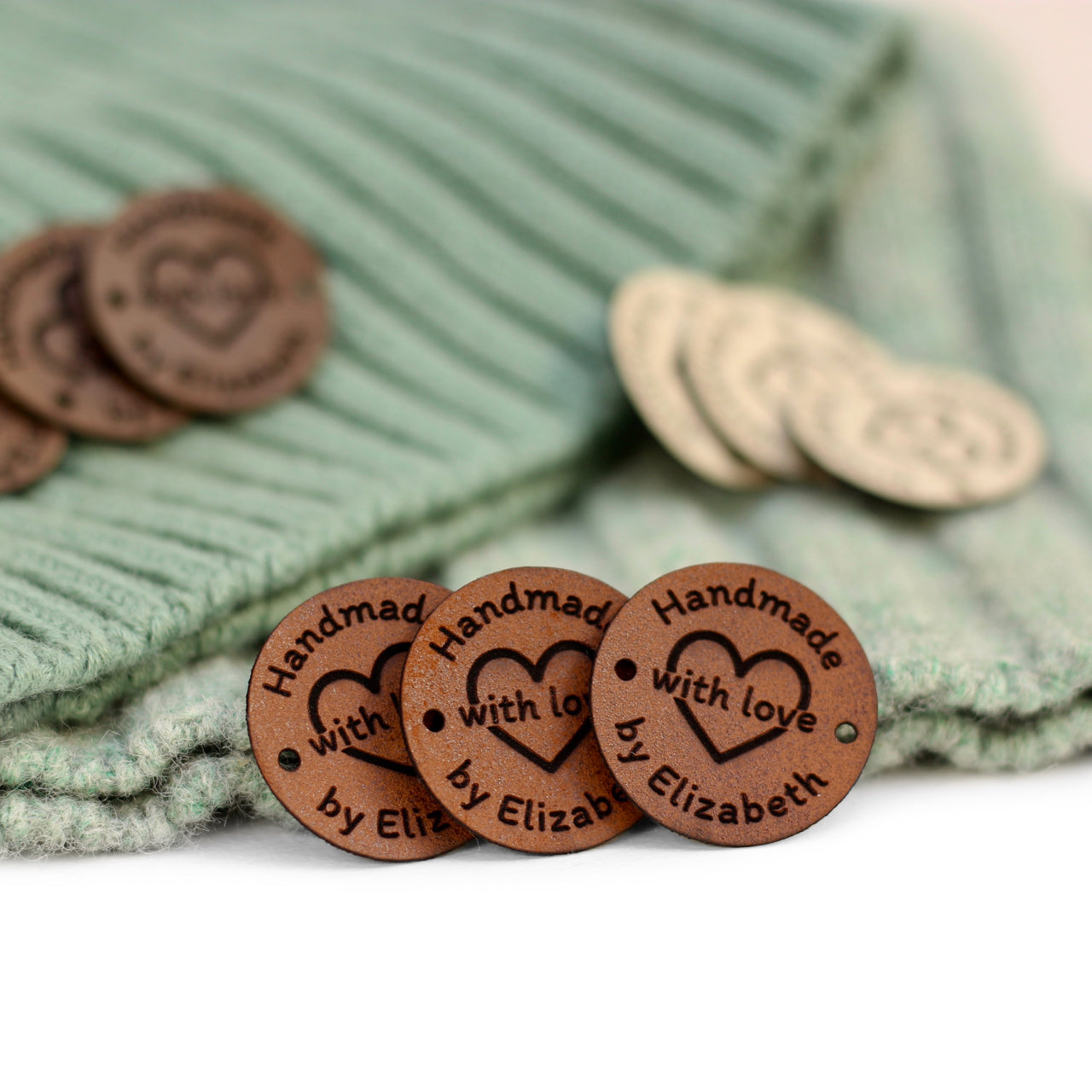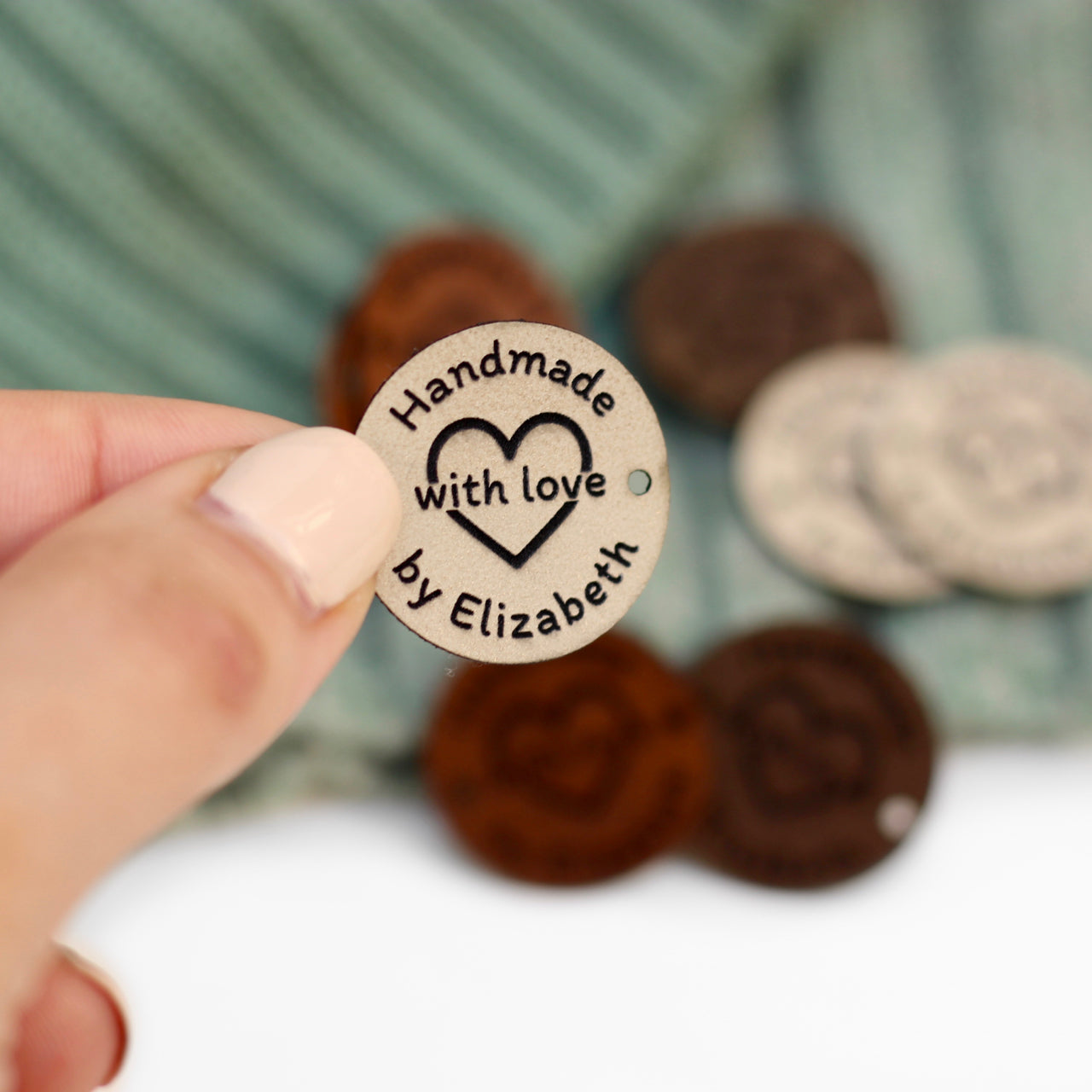 Your chosen quantity of Handmade with Love by [Your Name] faux leather tags in your selected colors.